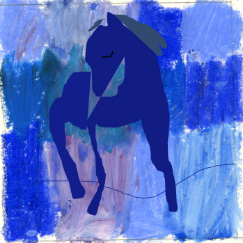 Fortfarande upptagen av att de mörka blå kulörerna möjligen förmedlar ett sorgset uttryck, prövar jag detta i bild. Det jag upptäcker är att linjeteckningen har mer av ett sorgset uttryck än den fyllda figuren. Formen på hästens (jag använder ordet häst i stället för ryttare) mule förmedlar det – ger ett vilande, mjukt och eventuellt sorgset intryck. Kanske melankoliskt. Linjeteckningen kan också tolkas som en idé om en häst som har befunnit sig i landskapet. Den fyllda blå figuren däremot tar ett skutt (livaktighet). Mulen är snett avskuren och dess vassare form understryker rörelsen. Sammanfattningsvis har formen en avgörande betydelse för helheten, hur vi tolkar innehållet i de båda bilderna.