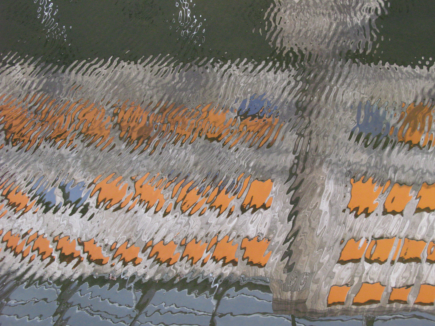 Är vattnet eller vattenytan genomskinlig? I Vattentransparens II blir det möjligen tydligare att speglingen av fasaden ligger under vattenytan. Där kan man även möjligen använda ordet siktdjup; eftersom de ur upplevelsesynpunkt ljusblå färgerna ligger djupare under ytan än de orange.