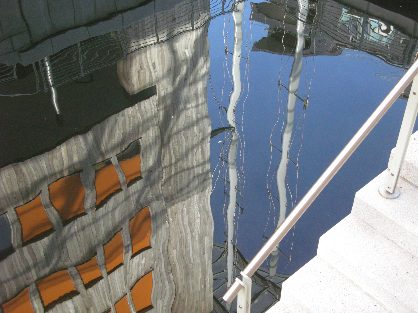 När jag betraktar fotografierna upplevelsen även jag en känsla av djup i bilden, färgerna ligger i nivåer och det är som om de blå färgerna bryts djupare ner i vattnet, Nina kallar det siktdjup. Rent fysikaliskt är det inte så, hela spegelbilden speglas på vattnets yta och ingen spegelbild framkommer djupare ner i vattnet. Här uppkommer för ett ögonblick en av de saker som jag finner spännande i mötet mellan konst och vetenskap, att upplevelsen är en men den vetenskapliga förklaringen en annan. Jag drivs vidare av min nyfikenhet och strävan efter att förstå. Jag upplever siktdjupet trots min vetskap om att bilden speglas på vattnets yta.