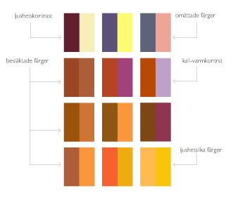 I fig. 1 ser vi en färgsammanställning av olika slags färgbegrepp, varav ljuhetskontrast ligger i översta raden. I planteringen (vid sidan om växthusen) med olika slags dagliljor (Hemerocallis) förekommer ljushetskontrast, här i bild (fig. 2) med varma färger i orange, rödaktigt och mörkt brunrött. Trädgårdspersonligheten Gertude Jekyll skulle säga att dessa färger är harmoniska, de som ligger nära varandra i den tolvdelade färgcirkeln. Kontrast och harmoni kan alltså utgöra en balansakt.