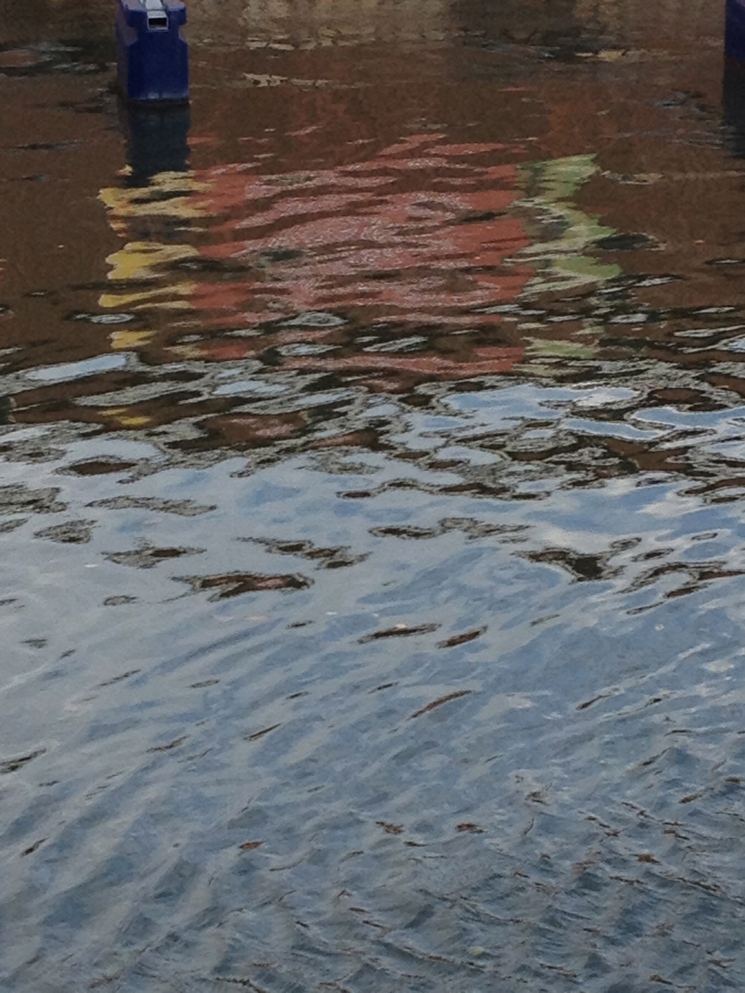 Färgschemat innehåller grönt färger, både kallt och varmt i olika valörer, purpur, ljust blått och en varm röd. Den röda har stor betydelse för helheten, tillför en extra (komplement) kontrast utöver ljushetskontrasten.