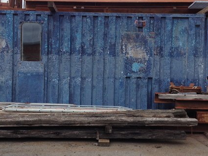 På Ringön i Göteborg, närmare bestämt Gotenius varv, står denna container som farit långväga och bland annat befunnitsi Ishavet. Blått i olika kulörer och valörer, ristningar och skrapningar, ishugg och slag (?) blir till grafik eller grafitti eller till en målad abstraktion.Blått Gotenius_ 2016