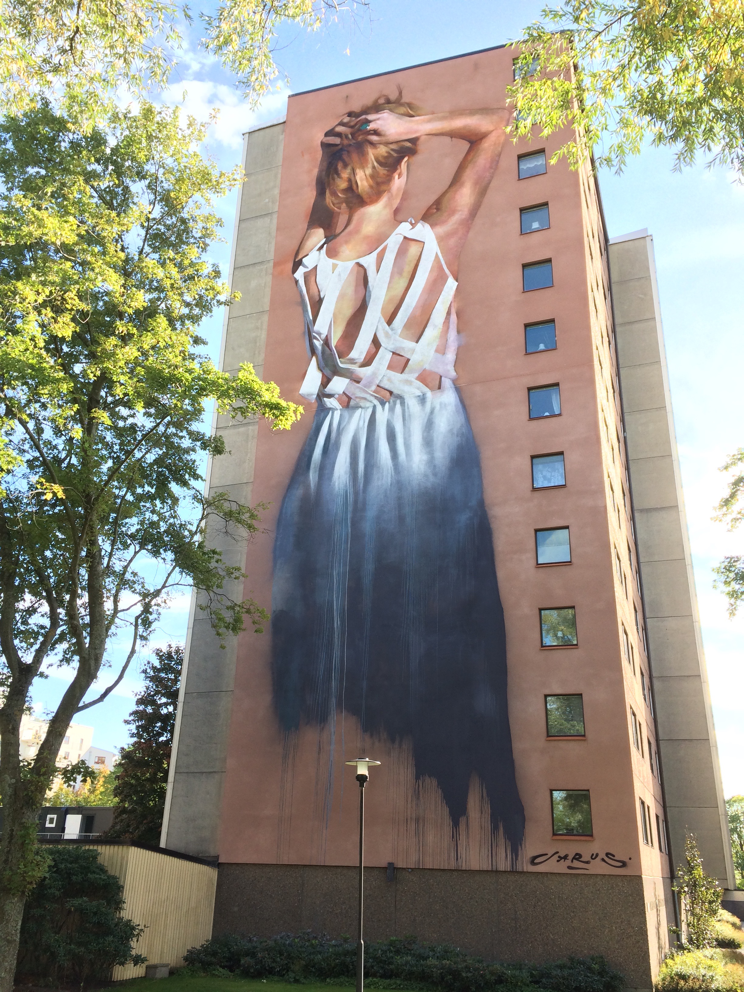 På Artscapes hemsida står det att Jarus ”Inför varje verk fokuserar … på att välja färg och bildkomposition som passar den specifika väggen och dess omgivningar”. Det känns i bilden. Rent färgmässigt är det en fullträff, den blågrå färgen är en stark kontrast till den terrakottafärgade fasaden. Blått poppar ut och lyfter nästan från underlaget, något som konstnären utnyttjat väl. Huden på kvinnans armar och rygg går i samma färgskala som fasaden. Vi ser hur konstverket hänger samman med fasaden och bildar en helhet. Inget är lämnat åt slumpen, inget känns malplacerat.