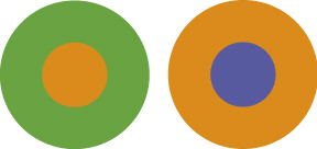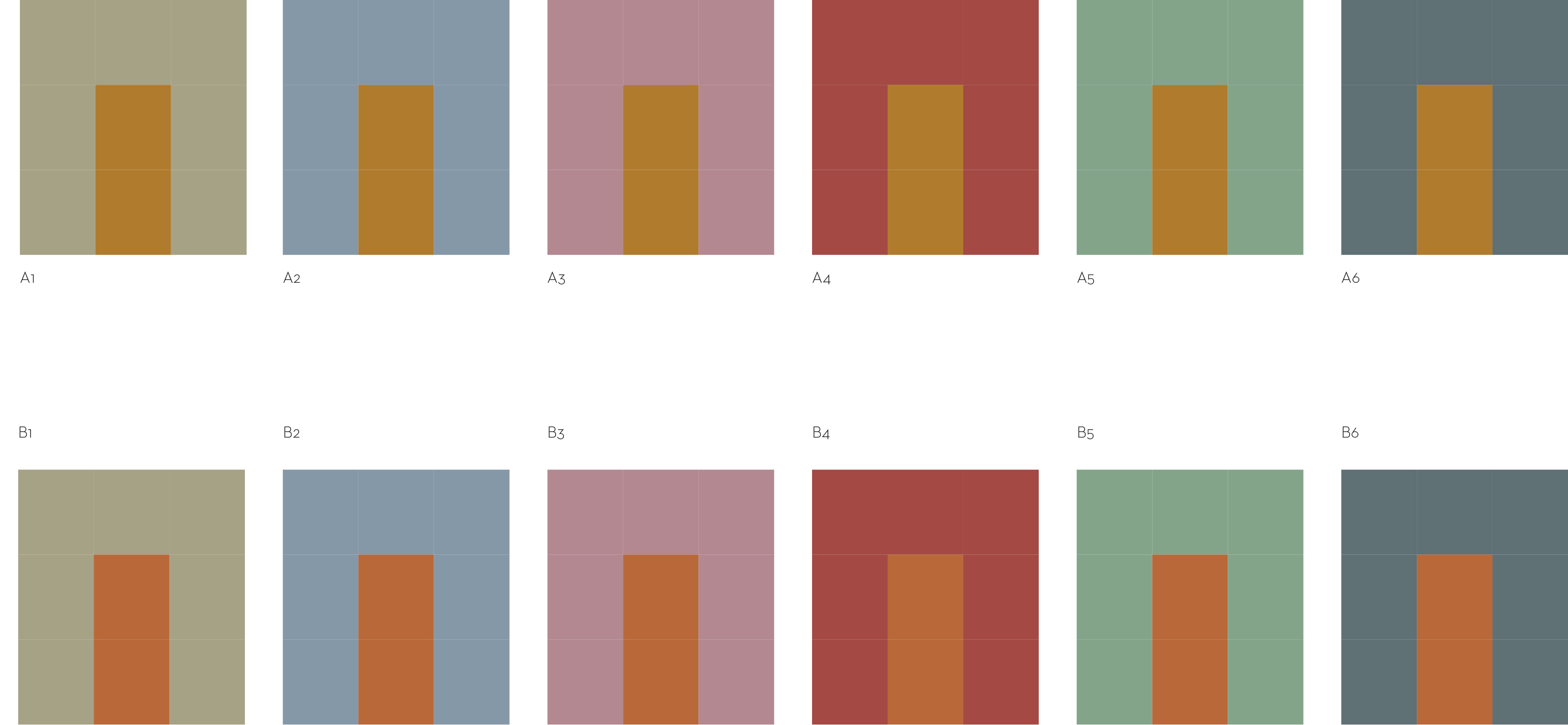 Det är svårt att få den gulorange att smälta in i fasaderna, den fungerar eventuellt bättre mot den blå och den rosa, se exempel A2 och A3. I nedre raden fungerar det över lag bättre, särskilt bra i exempel B1, B5 och B6 men även B2 fungerar väl.