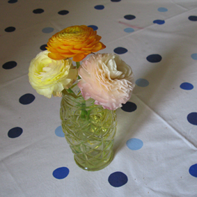 Ett grönaktigt hus, ett ljusblått, ett rosa och ett rött. Rent spontant upplever jag att orange passar rätt bra till det ljusblå och det rosa huset men inte lika bra till det gröna och röda.