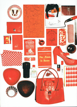 Lotta Kühlhorn. Sida ur kapitlet om rött. En rolig och inspirerande sida om röda saker, böcker och andra användbara föremål.