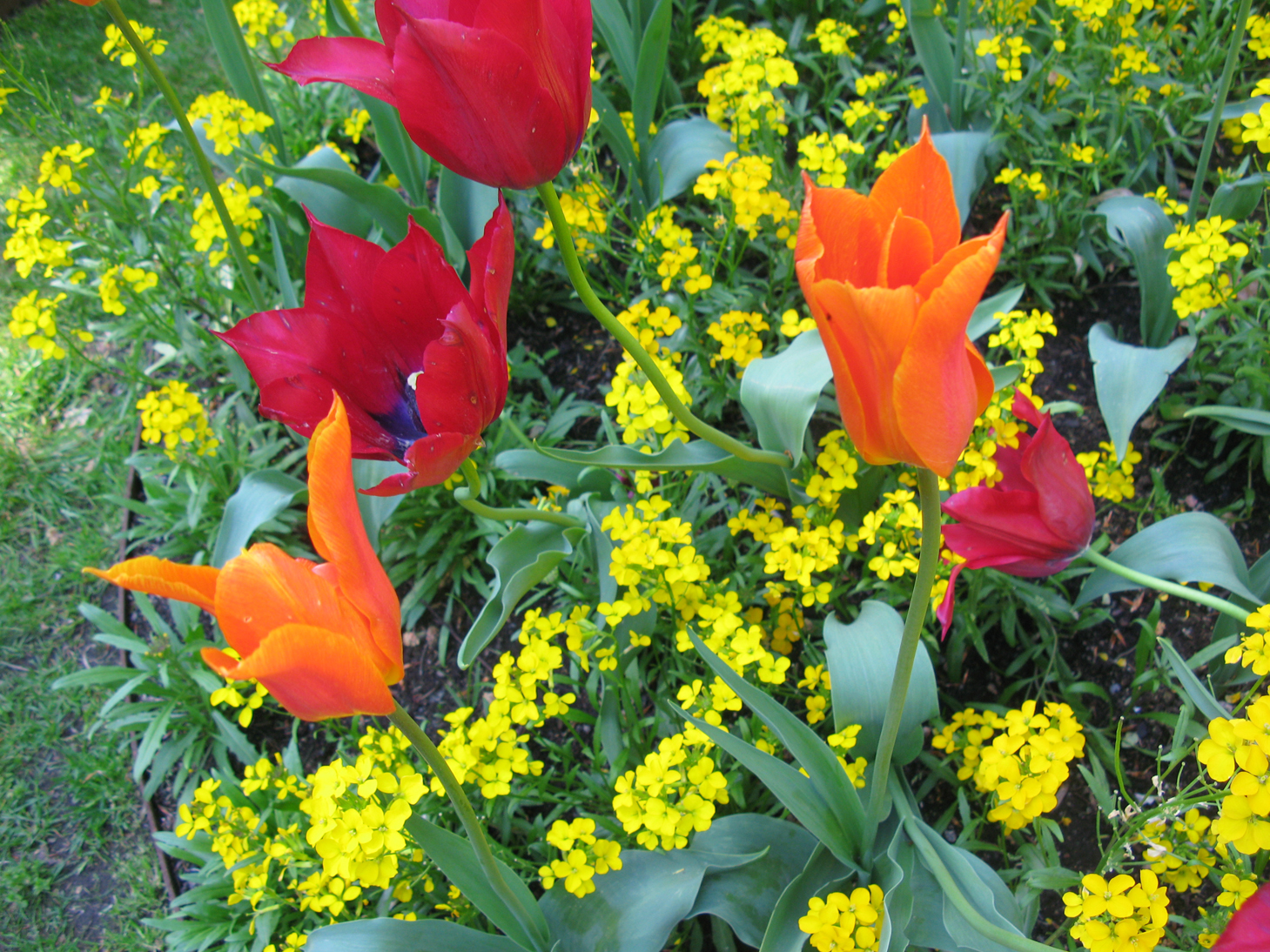 Målaren kan alltid måla över om någon färg blir fel, inte stämmer med den vision eller den färgbild man haft. Växter är det inte lika enkelt att byta ut. Man behöver god kännedom om de enskilda kulörerna och ha en kvalificerad idé om hur de kan verka tillsammans. Just denna dag har solen stor betydelse för upplevelsen av färgerna. Eftersom tulpanerna är så pass högresta visar sig kronbladen högt uppe, liksom svävande i luften med det strålande solljuset rakt igenom bladen, som om de vore tunn hud. Stämningen är både festlig och skört nyanserad.