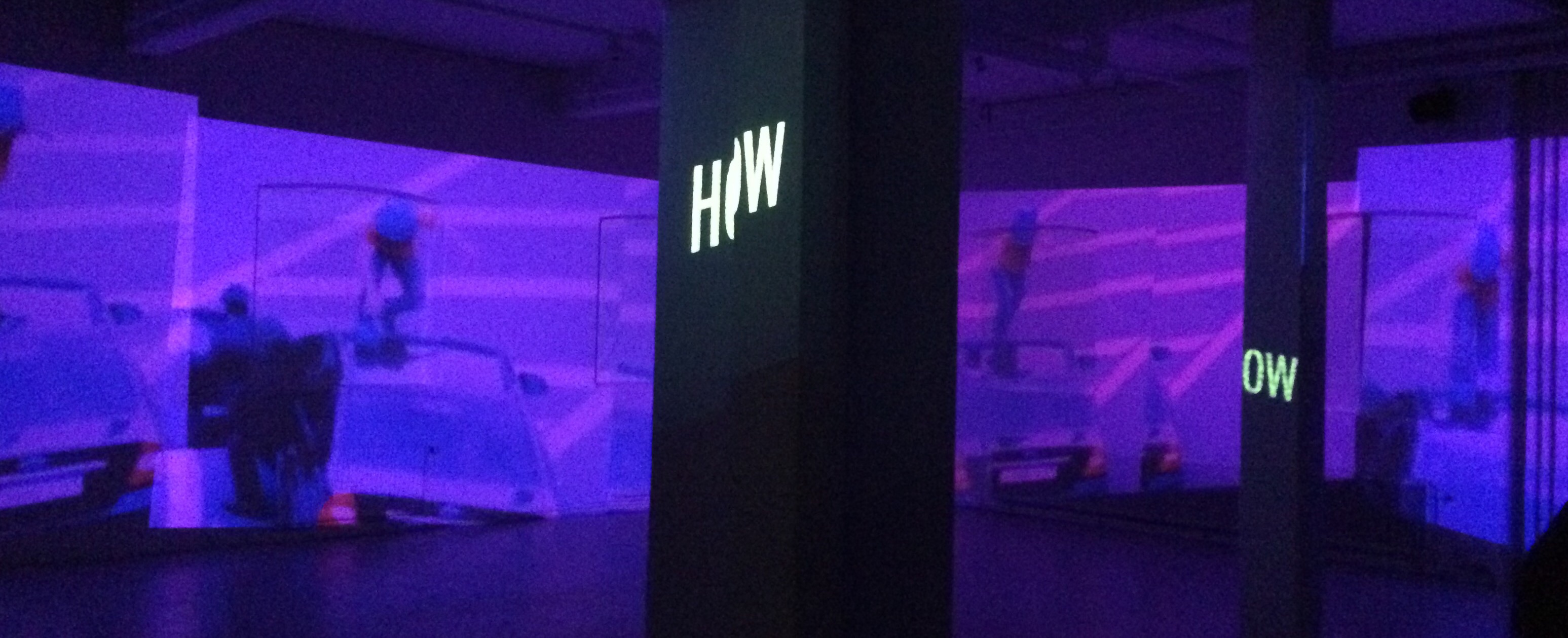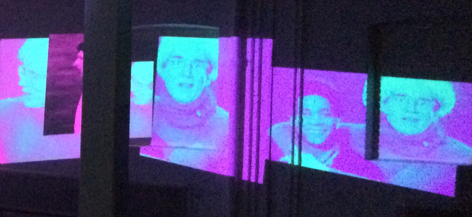 Först möttes vi av en grafisk glad gubbe. Jag visste inte vad detta handlade om riktigt men tyckte att storleken och närheten till projektionen var imponerande. Det strålade och ändrade färg och rörde sig runt de svarta elementen.