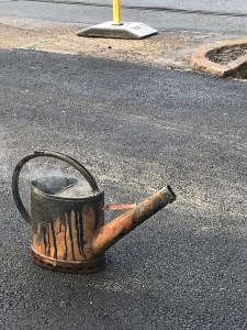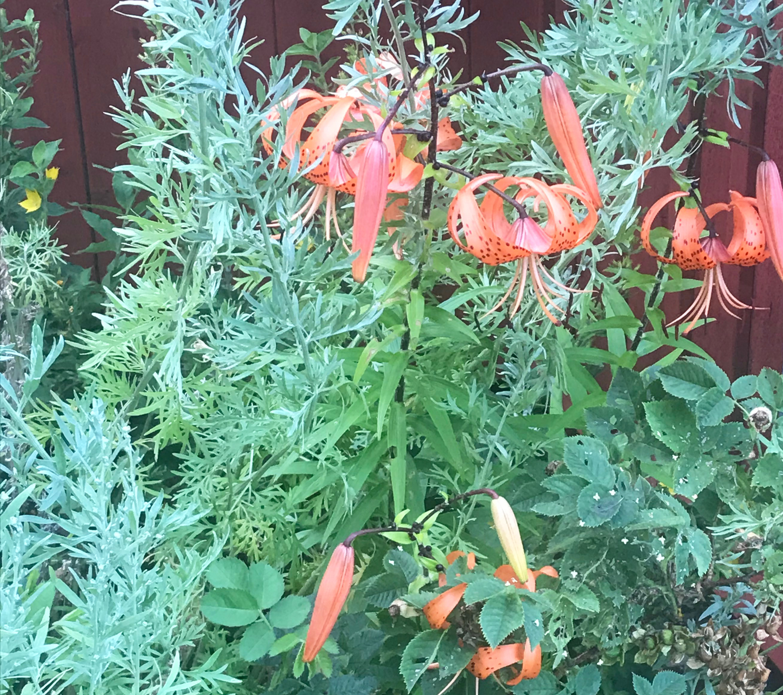 I en annan rabatt står tigerliljan tillsammans med vår inhemska malört. Där uppstår komplementkontrast. Malörtens gracila grågröna blad får en blåaktig ton i mötet med de orange kronbladen. Liljans form framhävs, omringad av malörtens stråliknande blad.