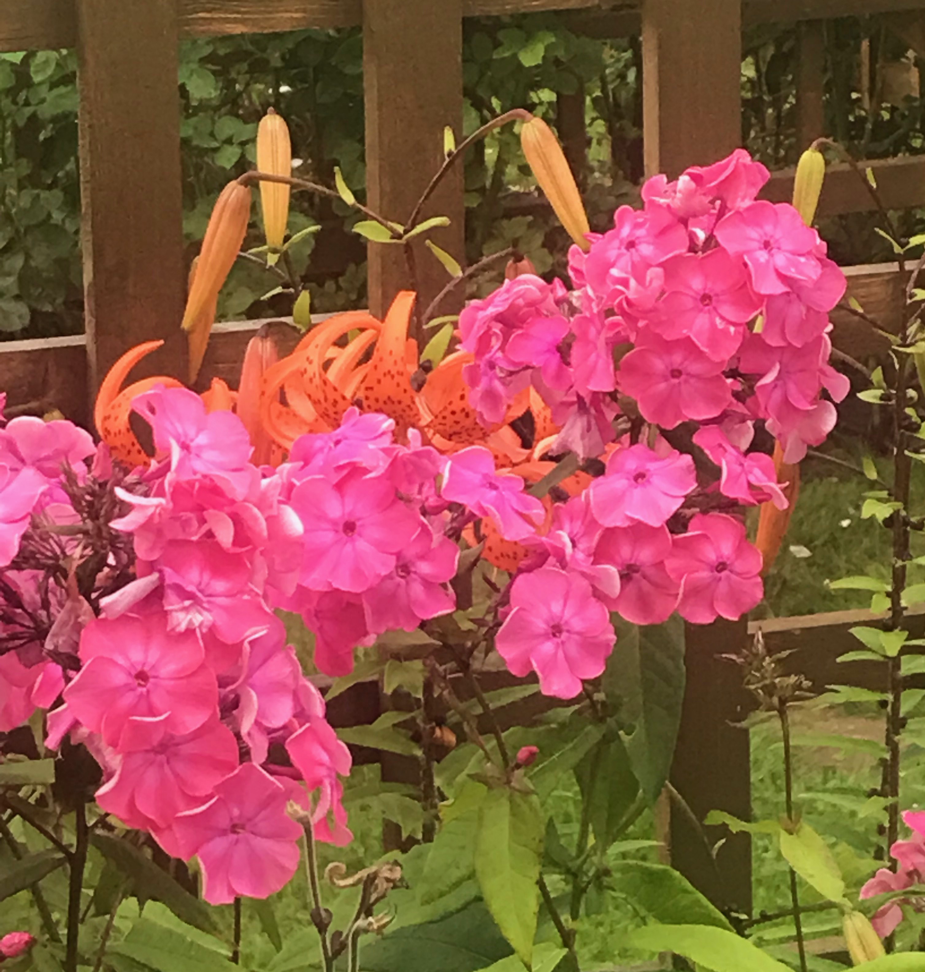 Trädgårdsväxterna rosa höstflox och tigerlilja – konkurrerande uttryck i färg och form.