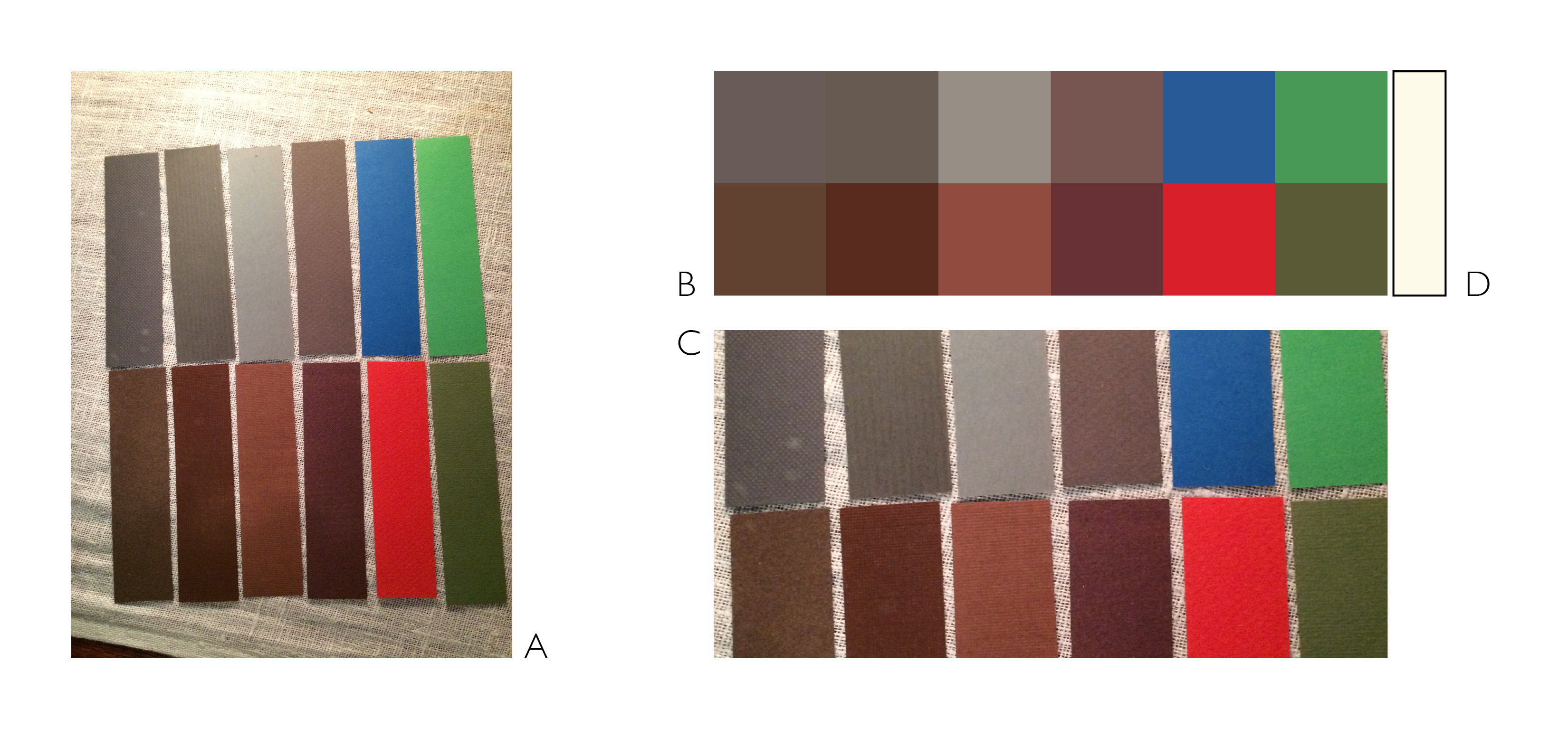 A: bild över mina färgprover i neutralt ljus. B: Färgschema där jag ”plockat” kulörerna från fotografiet. C: Närbild på färgproverna. D: Kulören på den ljusa duken, vilket ger en fingervisning om vilken kulör ljuset har.