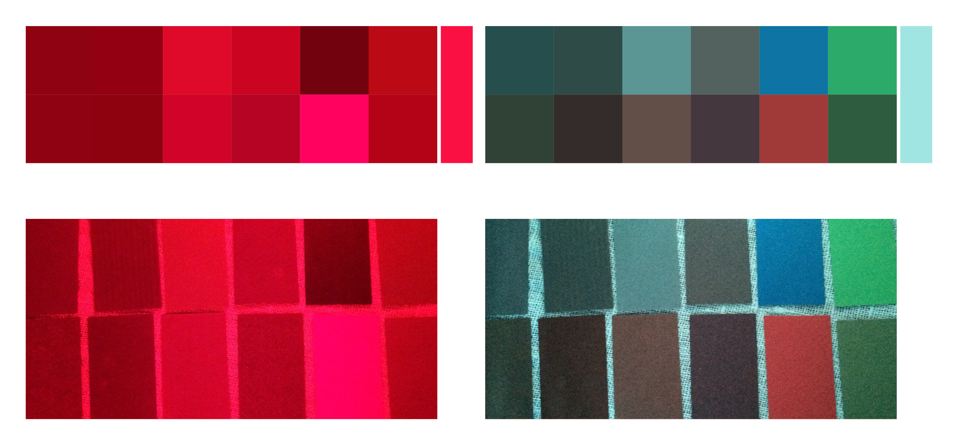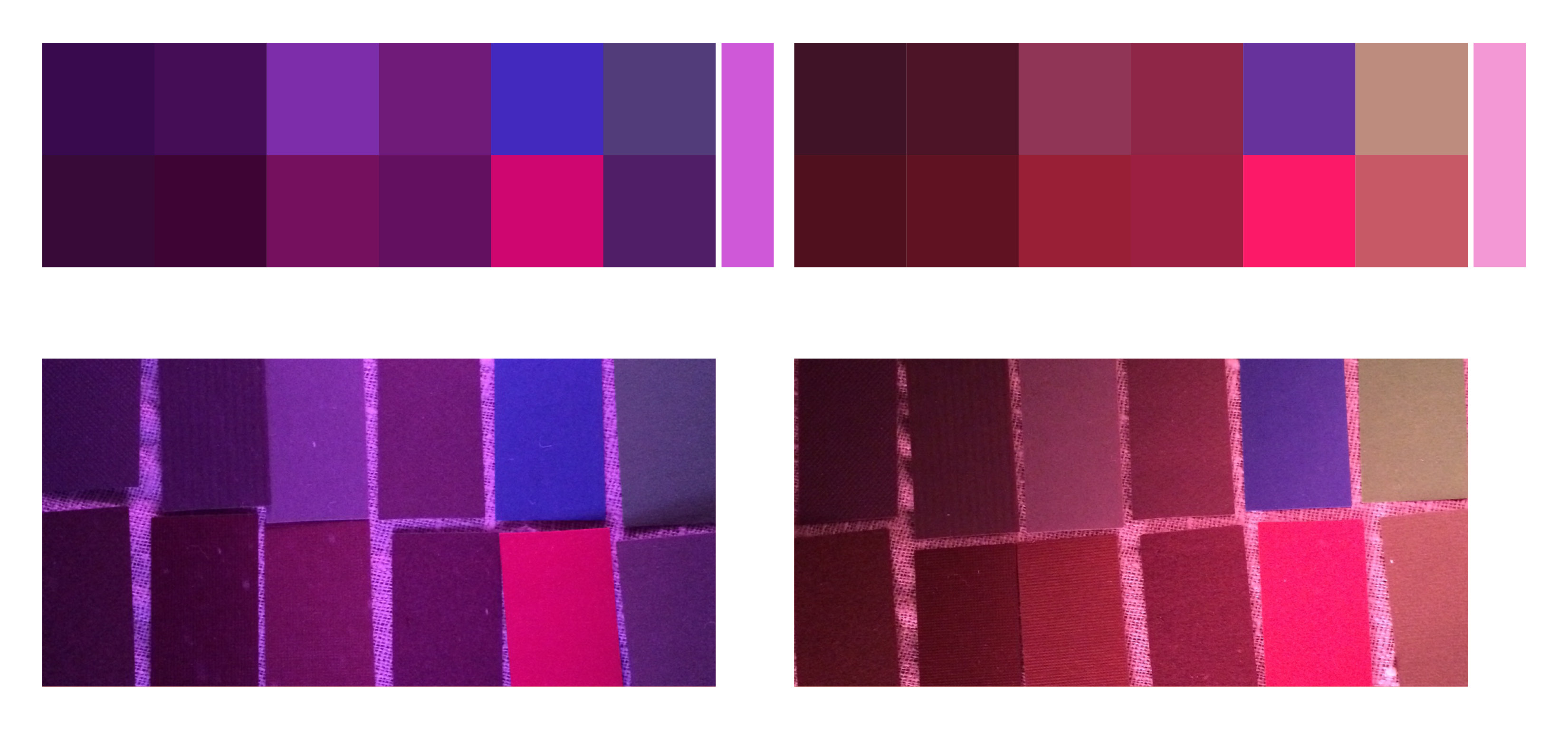 Två olika rosa ljus, en svag nyansskillnad i ljuset får stor påverkan på färgproverna. De grå och bruna går ihop. I det vänstra färgtestet slås de gröna helt ut och blir grå medan de i det högra snarare blir bruna.