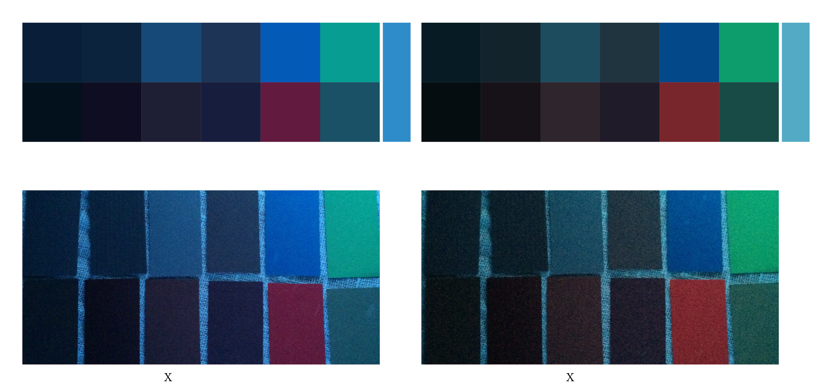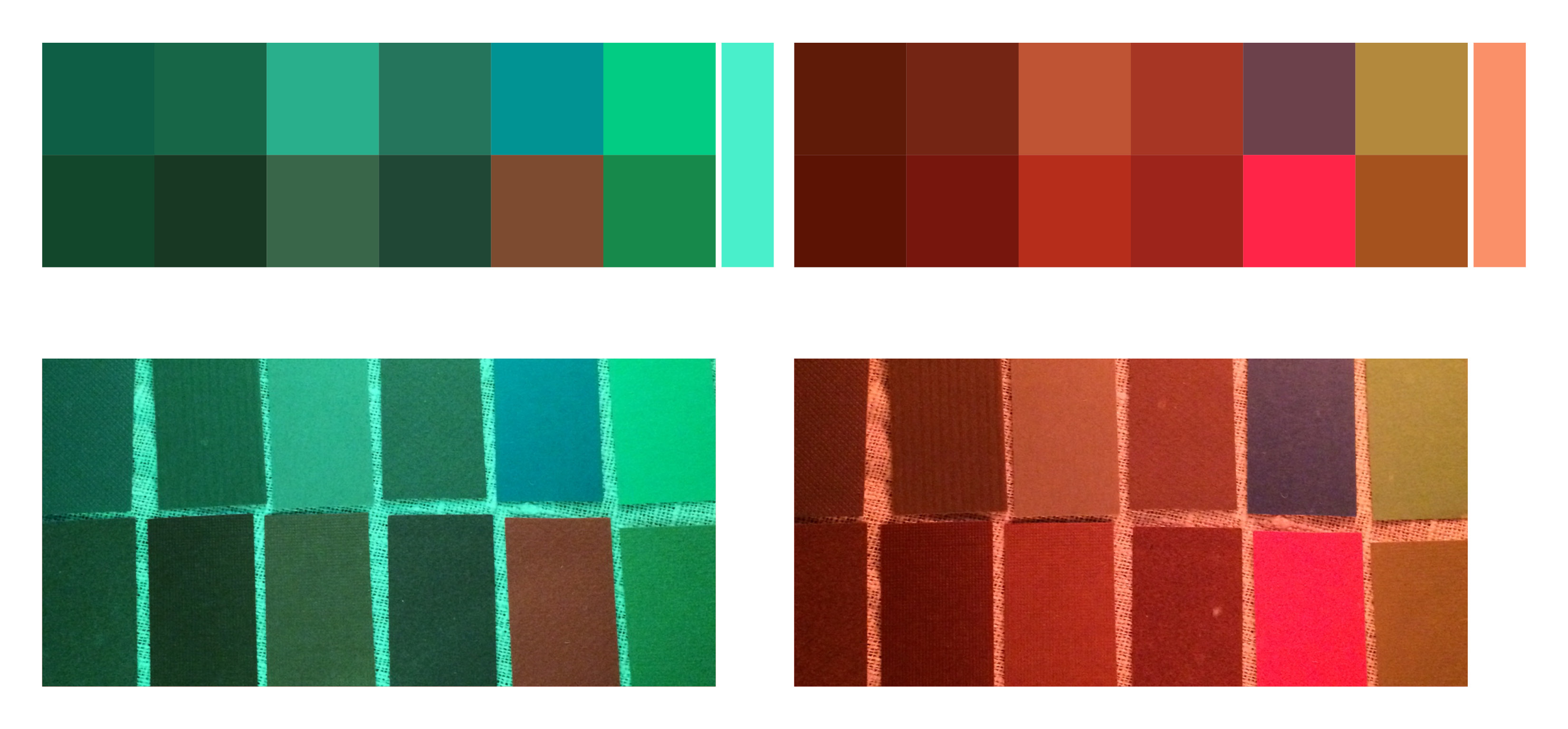 Vänster: Ljust turkos ljus. De bruna färgproverna är inte längre bruna, de förlorar all värme och karaktär. De grå proverna reflekterar det turkosa. Det övre gröna blir ljusare (så som vi upplevde att det röda blev ljusare i rött ljus) och det undre mörkare gröna blir mer intensivt grönt, kulören förstärks av ljuset.