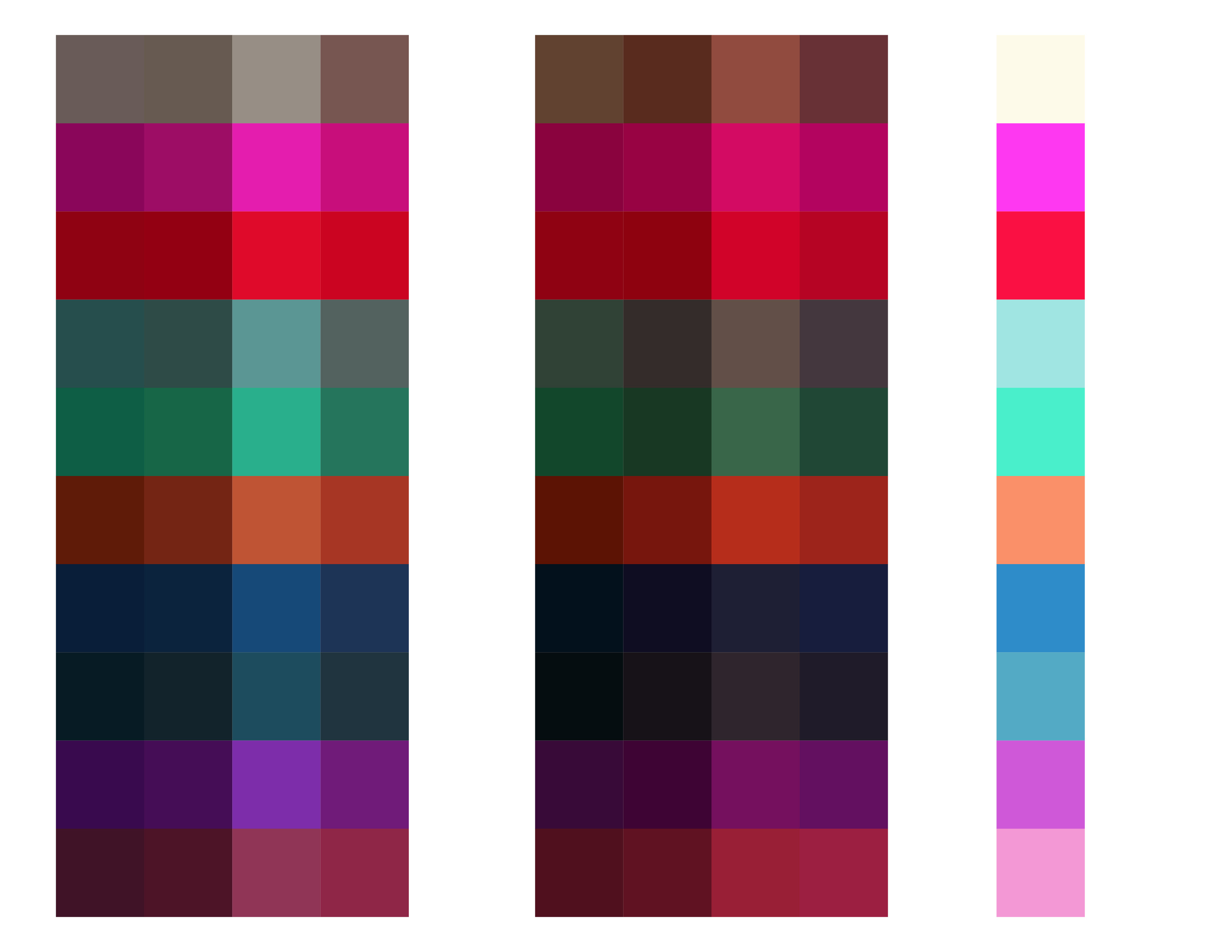 Här uppstår ett fenomen som jag egentligen inte kan förklara. Färgprovet i undre raden, tredje från vänster, är en ordinär brun. När jag belyser färgprovet med blått, som i det vänstra exemplet, får det en färg men när jag belyser det med en annan blå, som drar mer åt grönt, som i det högra exemplet, då blir den bruna helt plötsligt mycket rödare och vinner i lyster. Detta är märkligt och märkliga saker sker ofta när man belyser just brunt, men även svart med färgat ljus! Det märkliga är att man snarare skulle kunna tänka sig att den turkos skulle neutralisera värmen i den bruna eftersom det är en komplementfärg, här blir det på sätt och vis tvärtom.