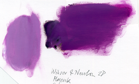 Nederst t h. Magenta (Winsor & Newton 28) blandad med svart (Beckers elfenbensvart) och vitt (Beckers blandat vitt). Kulören är dämpad med vitt och svart. Den framträder i olika valörer från mörkt till ljust. Jag ser att magenta (relativt sett) behåller sin renhet. Men, den ljusa valören har en dragning åt grått. Är den därmed smutsad?