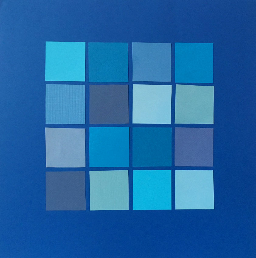 Montage av färgade papper. Det är som att den blå variationen framträder ännu tydligare mot en blå bakgrund.