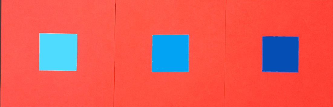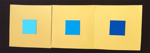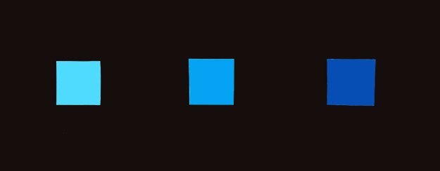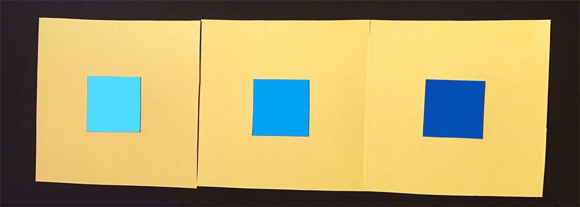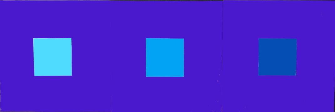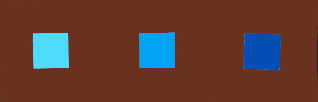 Här har vi de olika blå mot gul bakgrund. Kan man då på detta sätt pröva Ittens påstående? Förlorar det blå sin lyskraft?En ljus blå, som den längst till vänster blir inte mörk. Men den mellanblå blir mörk i förhållande till den gula bakgrunden. Den mörka blå är mest mörk, har den någon strålglans här? Knappast.