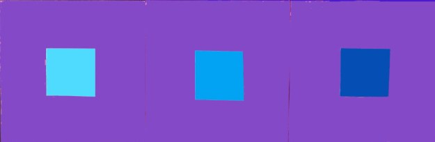 De ljusa blå får kanske tillbaka sin lyskraft men den mörkaste blå uppslukas helt av det lila, kontrasten är för liten. Denna lila är betydligt mindre röd än den ljusare lila, detta påverkar också vår upplevelse.