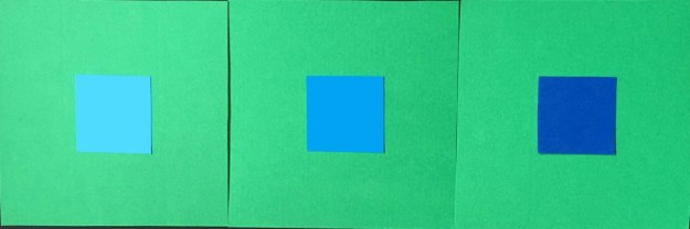 Den mörka blå framträder, den ljusa faller undan, den mellanblå existerar mot den gröna utan att någon av färgerna förlorar sina karaktär.