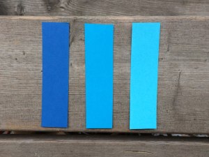 Jag valde så småningom ut tre blå för att använda i mitt projekt. En ljus, en mittimellan och en mörk. Målet var att de varken skulle dra åt grönt eller åt lila, det är svårt att finna men dessa är förhållandevis neutrala.