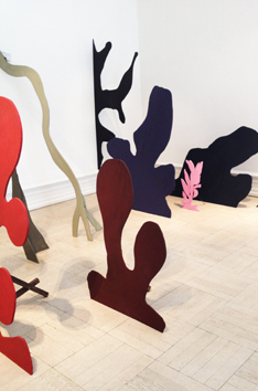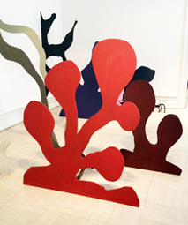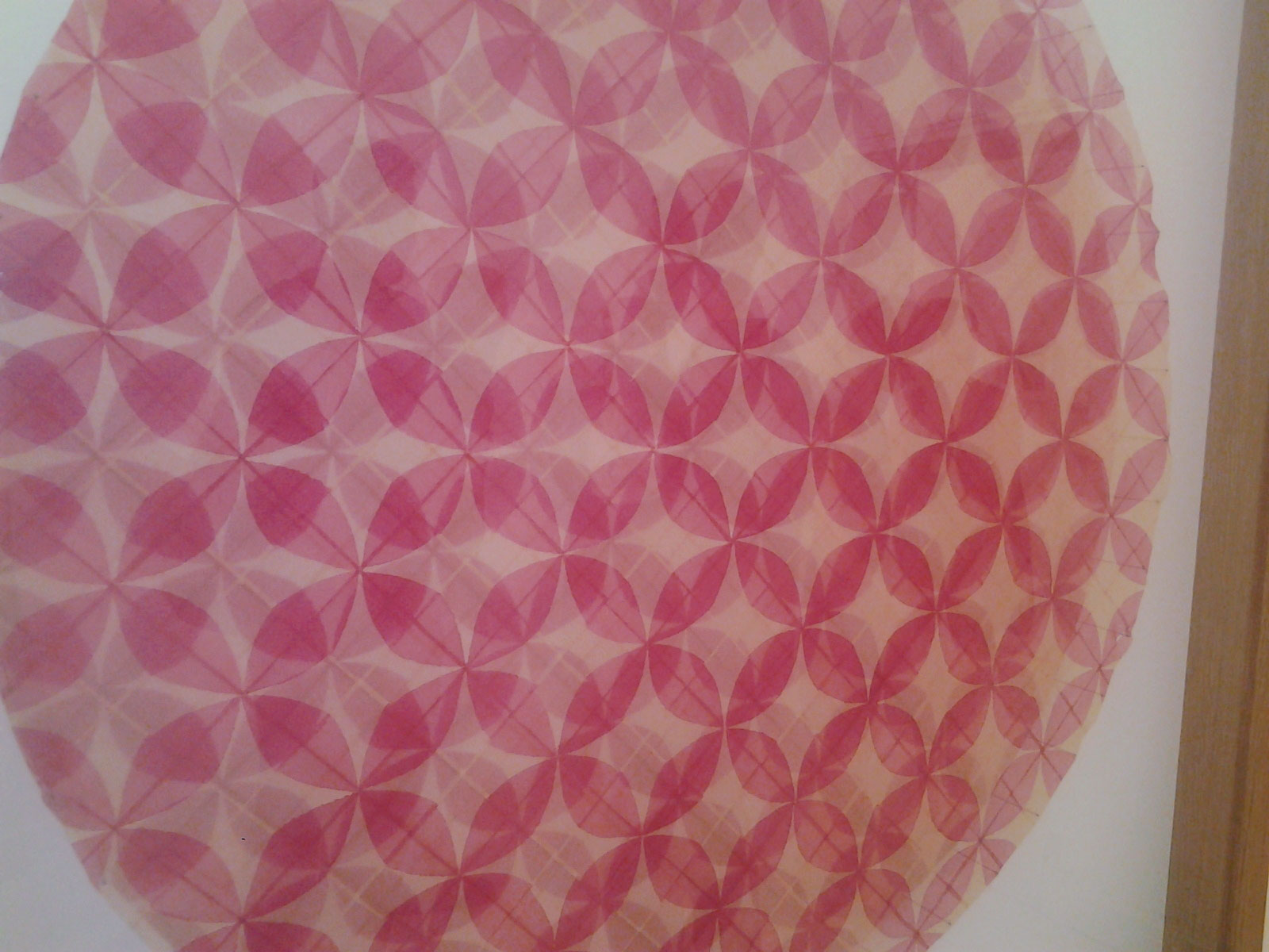 I det stora konstverket är bottnen beige och den röda mönsterfärgen har dragning åt cerise, en kall och stark rosa. Jag tycker att cerise är en hård färg och att beige är en rätt tråkig färg. När de kombineras på detta sätt förändras deras uttryck; den rosa färgen mjuknar tillsammans med den beige som fångar upp det rosa och blir lite gammaldags och mild. De olika röda nyanserna som bildas påverkar den beige så att den får variation vilket ger liv, det finns inget av det tråkiga beige kvar. Att konstverkets tyger hänger i lager bidrar till dynamik i bilden då färgernas styrka och kombinationer växlar med betraktarens rörelse.