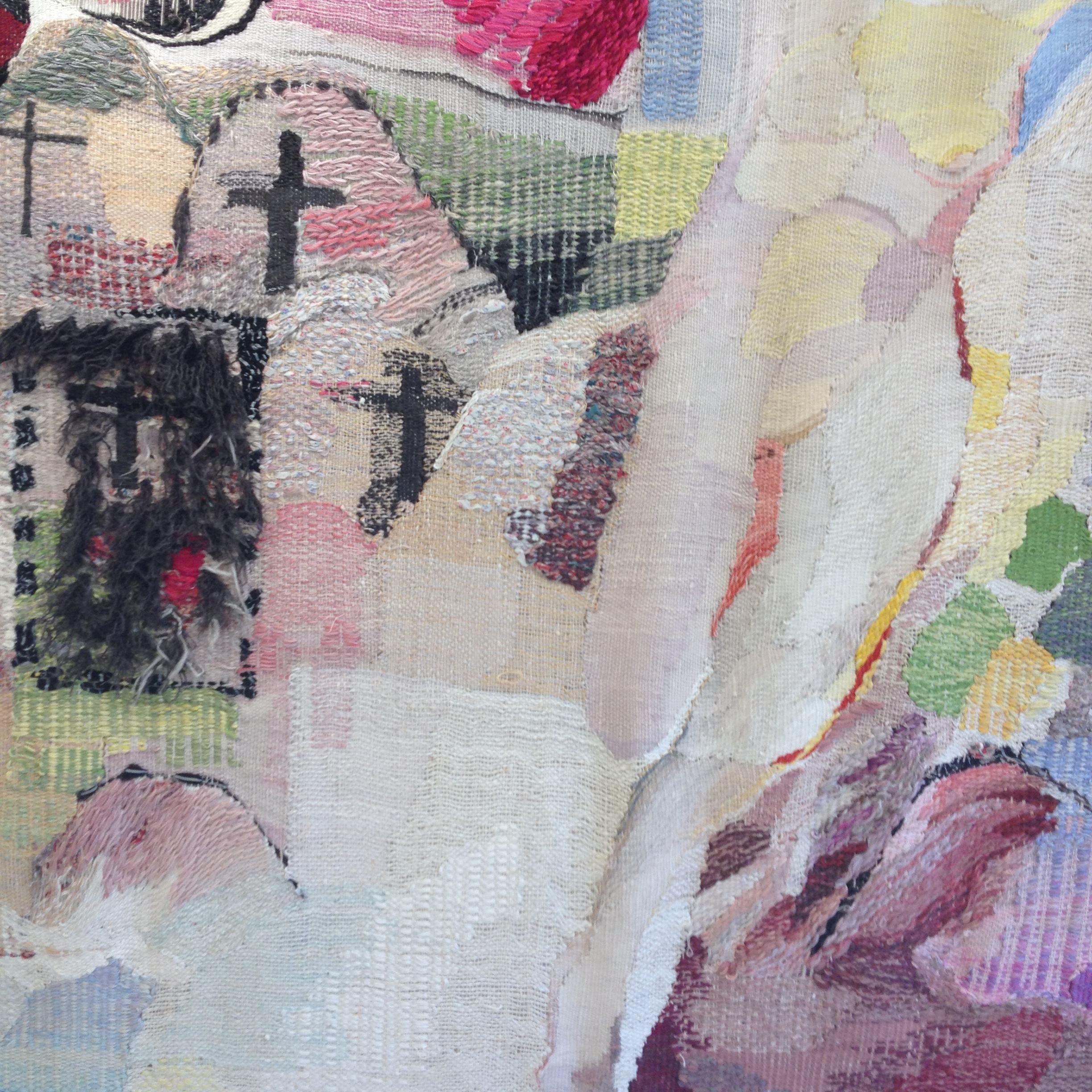 Maria Uleander arbetar med små moduler av tyg som hon har klippt, färgat och fogat samman i en meditativ process, de sitter monterade i två lager fritt skilda från varandra med förskjutet mönster vilket ger ett djup i bilden men också fler nyanser av färgerna. Hon har arbetat med rött i tre av sina konstverk. (Fotografierna är tagna av mig på plats och ger inte färgerna helt rättvisa, ni får ha överseende med detta).