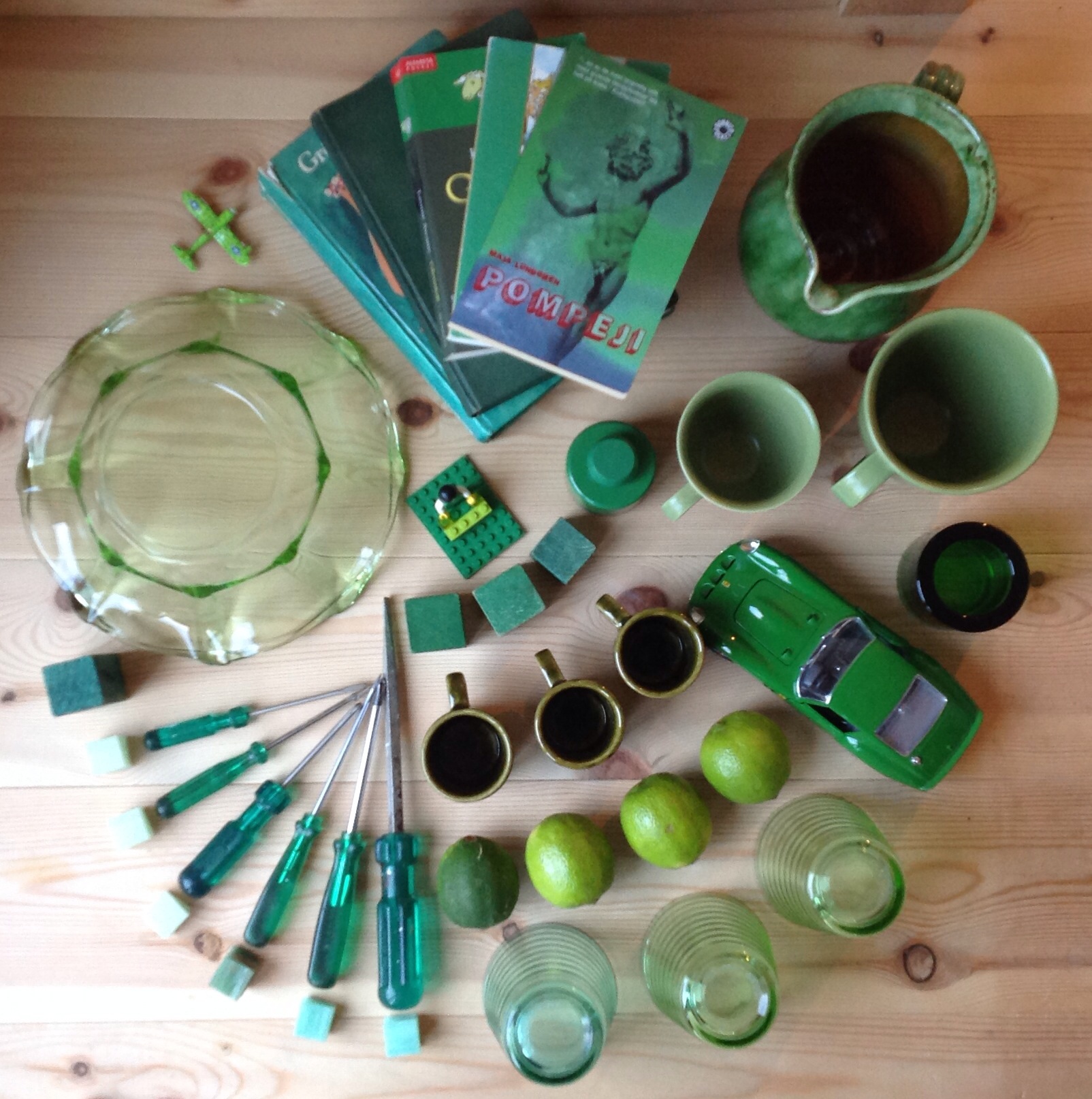 Sammantaget visades en hel del grönt och en hel del intensiva gröna kulörer. När det gröna blir kallare, när det drar lite åt blått, som på cyklarna då upplevs det inte lika intensivt i den mening att det inte pockar lika mycket på uppmärksamhet som t.ex. den gulgröna i golvet och i mossan. De varma gröna är betydligt mer uppmärksamhetskrävande.
