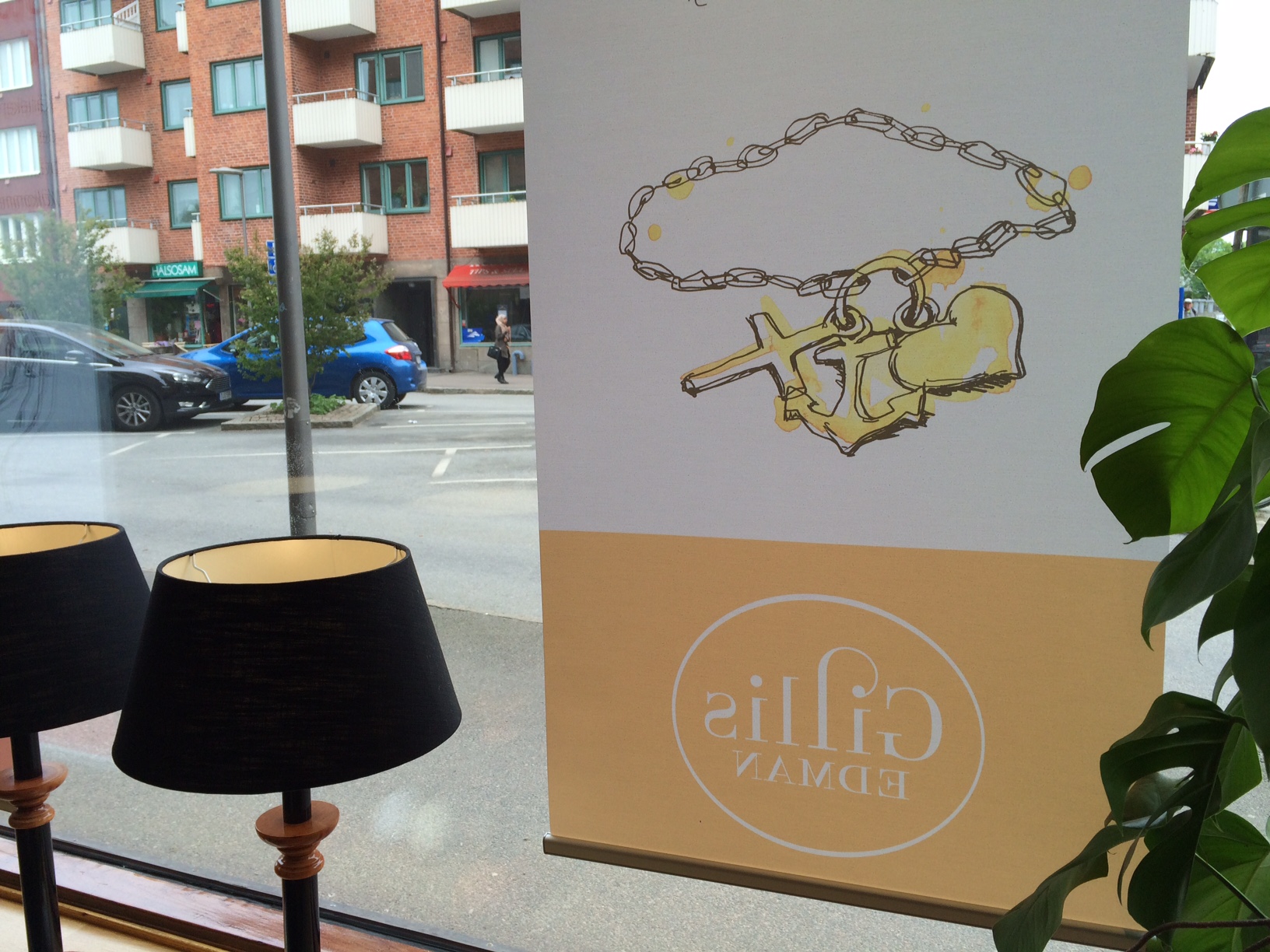 När vi ser på Gillis Edmans entré är den förhållandevis diskret. Inget sticker ut, framtoningen är snarare lite anonym. Planscherna som hänger i skyltfönstret rent färgmässigt harmonierar väl med fasaden, inget fångar direkt ögat.
