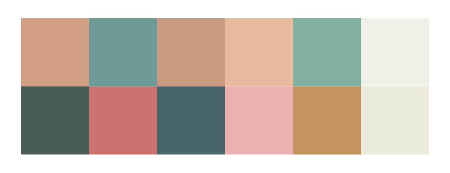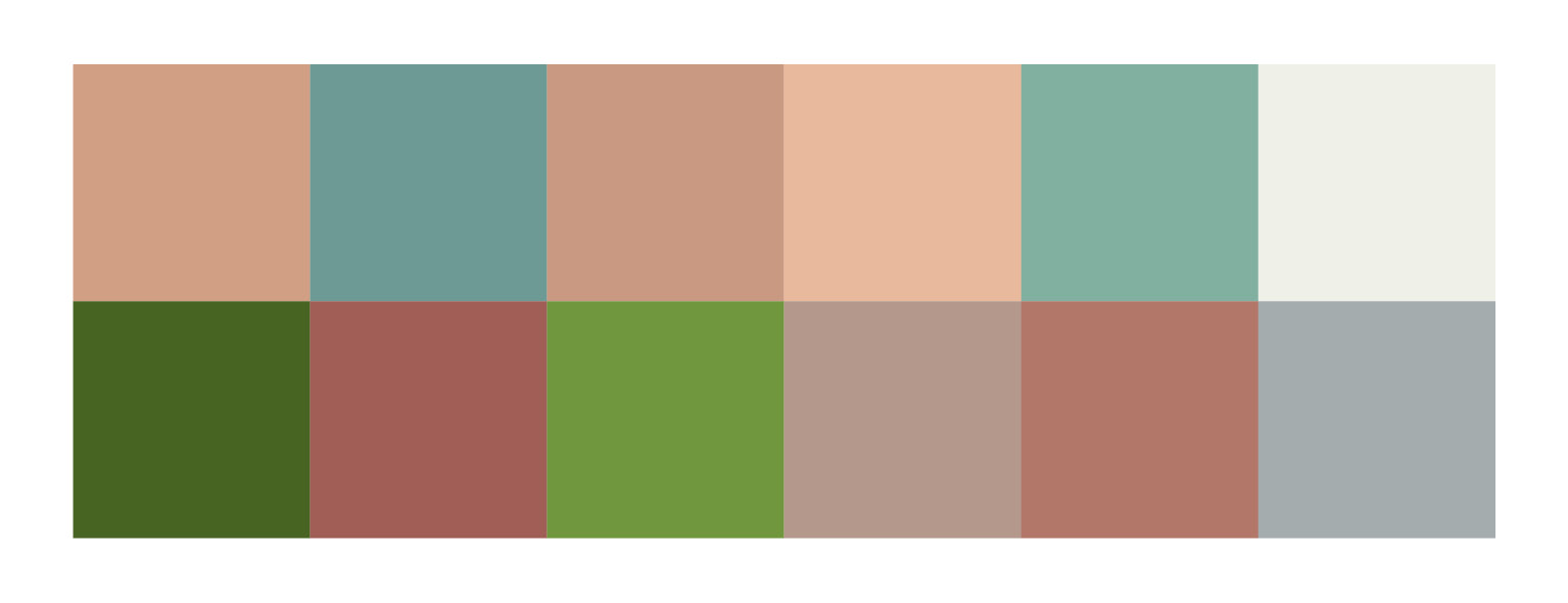 Fotografi och färgschema över inredning med soffa och matta på parkettgolvet. I färgschemats övre rad finns färgerna från Kusttorget med, i den undre raden återges färgerna inne i rummet..