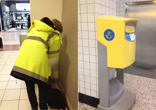 En kvinna i skarpt gult lyser tillfälligt upp ett hörn i Östra Nordstan. Den ilskna färgen på hennes kappa är avvisande. Hon skall synas bland nattens trafikljus. Jämför kulören på brevlådan som har en varmare och mer välkomnande gul ton.