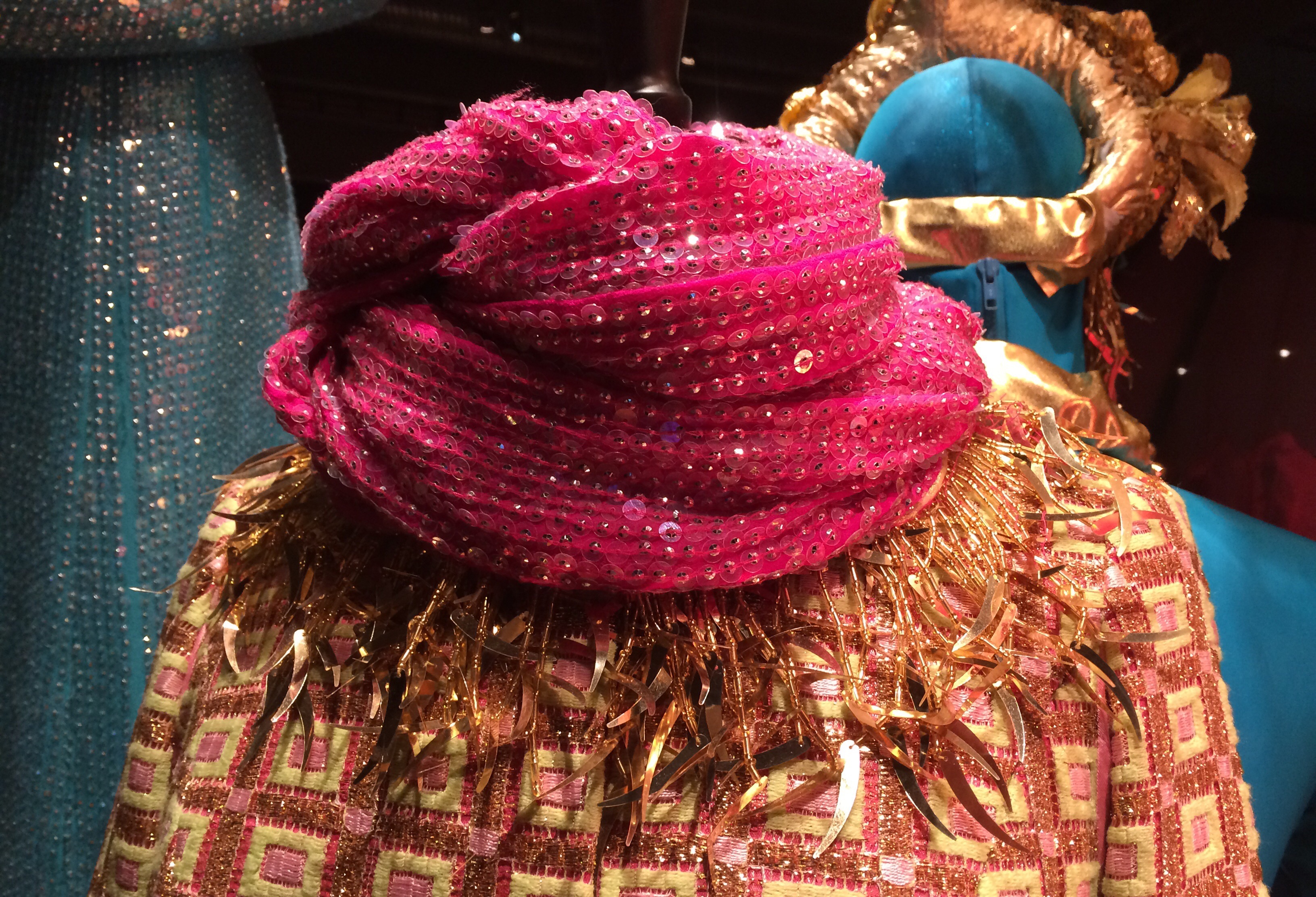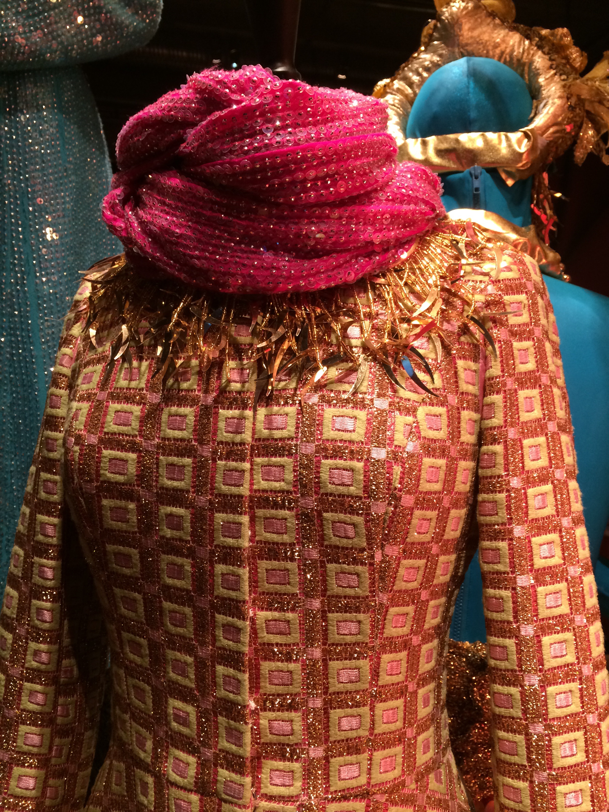 Här nedan en sjal eller scarf i starkt rosa klär en rock i guld. Fint tycker jag.