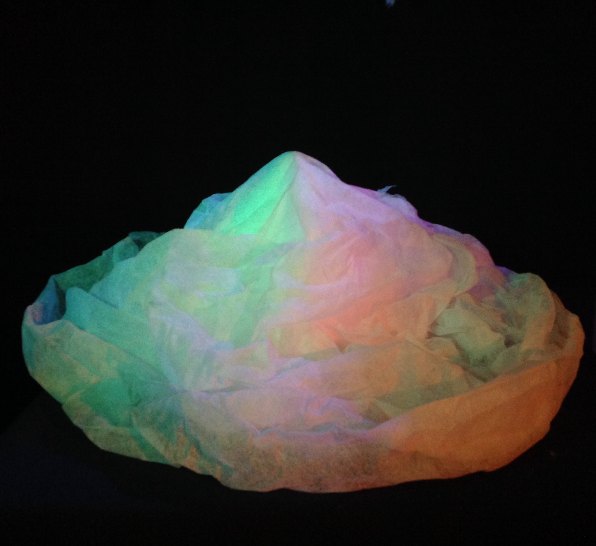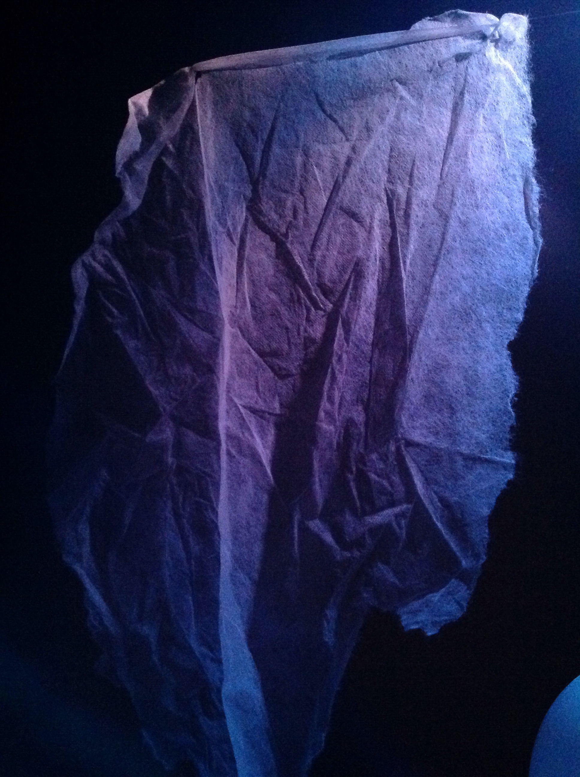 Lika kulör, olika ljushet: För att försöka åstadkomma exempel på ljushetskontrast belös jag det hängande tyget med endast en lampa (filtrerad med blått). Avsikten var att få fram en blå färg på tyget med flera olika ljushet:
