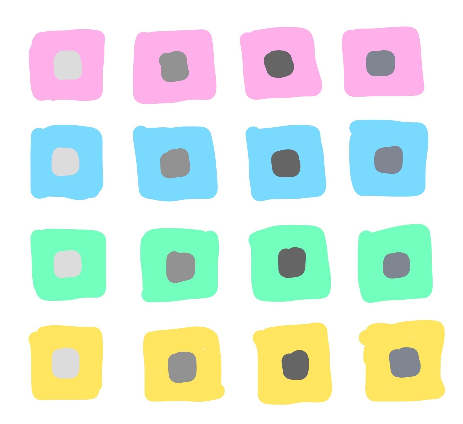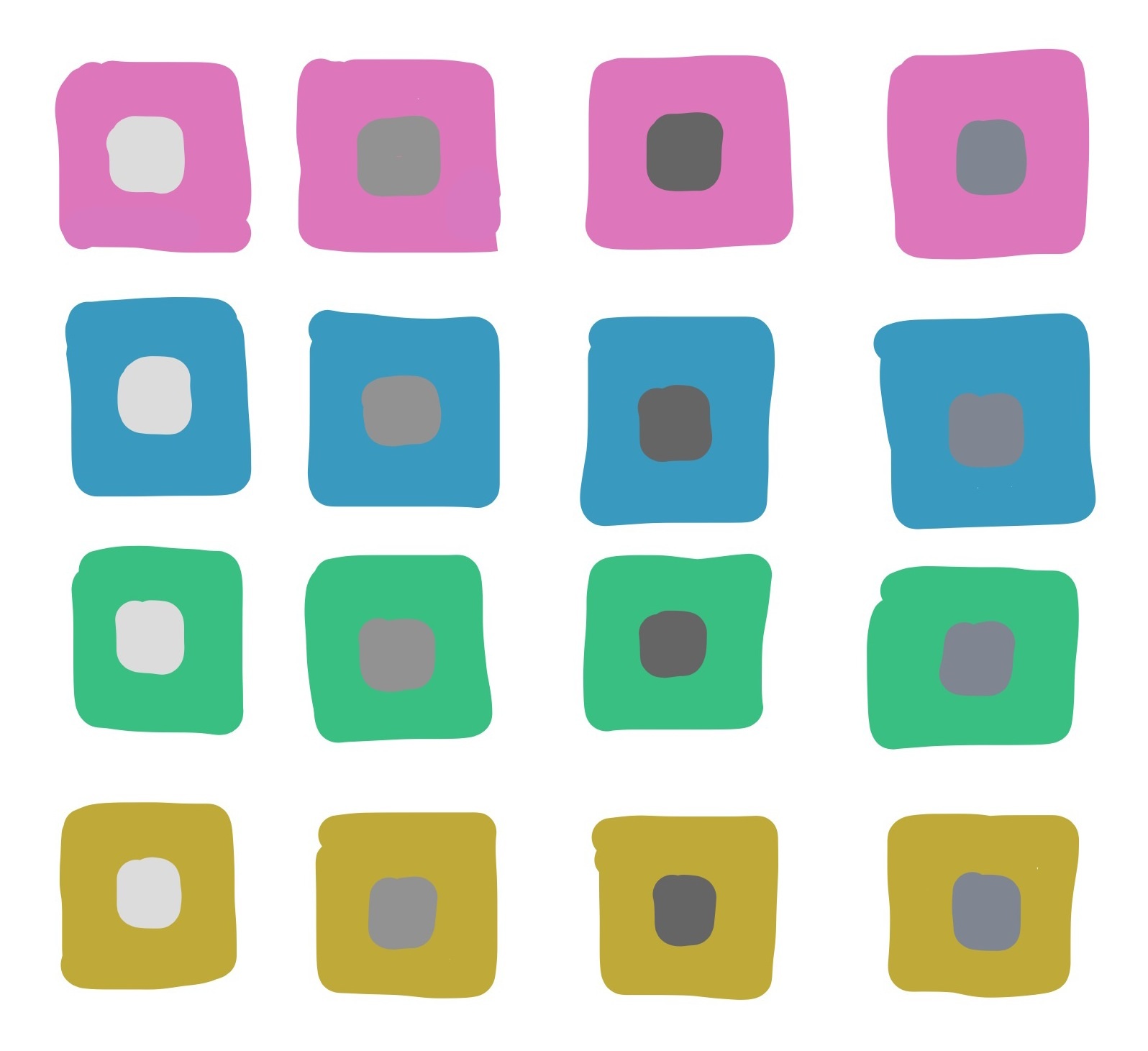Jag har valt att testa detta i tre enkla färgscheman som jag gjort i datorn. Grå ljushetskontrastBild 1. Vågrätt ser vi fyra olika kulörta färger, rosa, blå, grön och gul. Lodrätt har vi fyra grå en ljus, en mellangrå, en mörk och ytterligare en mellangrå.