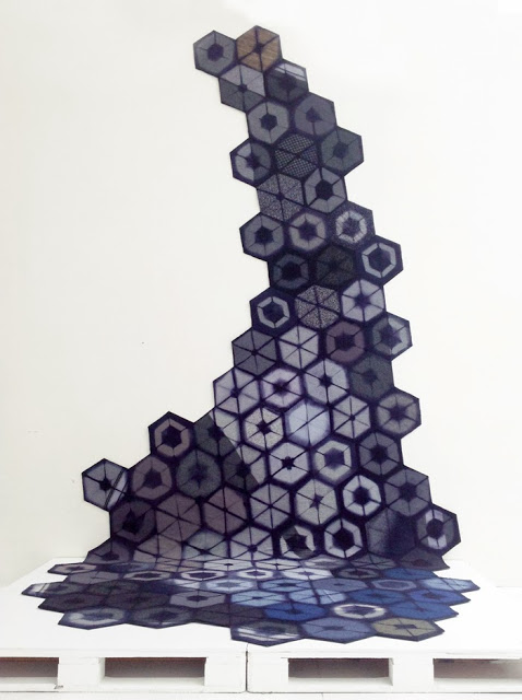 Milky way is the result of a meeting between two textile traditions with two very differing expressions. It is also the meeting between dark and light, diamonds and junk. We wanted to work with the hexagonal shape but not in the traditionall way used in patchwork quilts. The hexagon is also common in Japanese Shibori dyeing.  The rug is made of discarded woolen sweaters constructed with layers. The design is made by folding the hexagons into three and are then shibori-dyed in a dark indigo shade. In the composition we wanted to create sparkles and high lights to add lustre to the material.