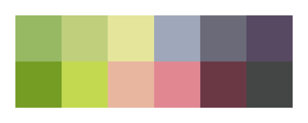 Färgschemat visar på färger som går väl ihop. Ljusa och mörka nyanser i varje kulör, det rosa-magentafärgade och i det grå som ibland drar åt lila står i väl kontrast till det komplementerande gröna som finns i både kalla och lite varmare toner. Fint.