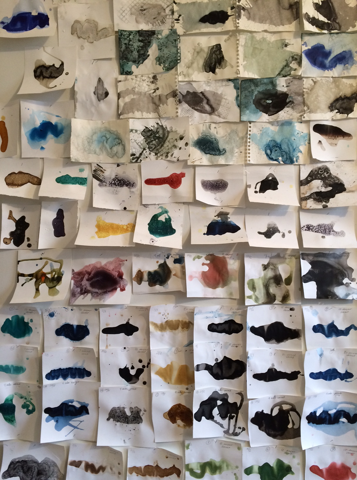 Anna Bergman undersöker färgen fysiskt. Vilka egenskaper den har och hur den beter sig på pappret. I katalogen läser jag: ”Hennes konstnärliga praktik utspelar sig till stor del i laboratoriet. Likt en strukturerad forskare gör hon färgblandningar av vatten och tusch som märks upp och loggförs med regelbundna mellanrum för att få fram ett exakt resultat. Processen fortsätter på canvasduken som spänns upp på golvet”
