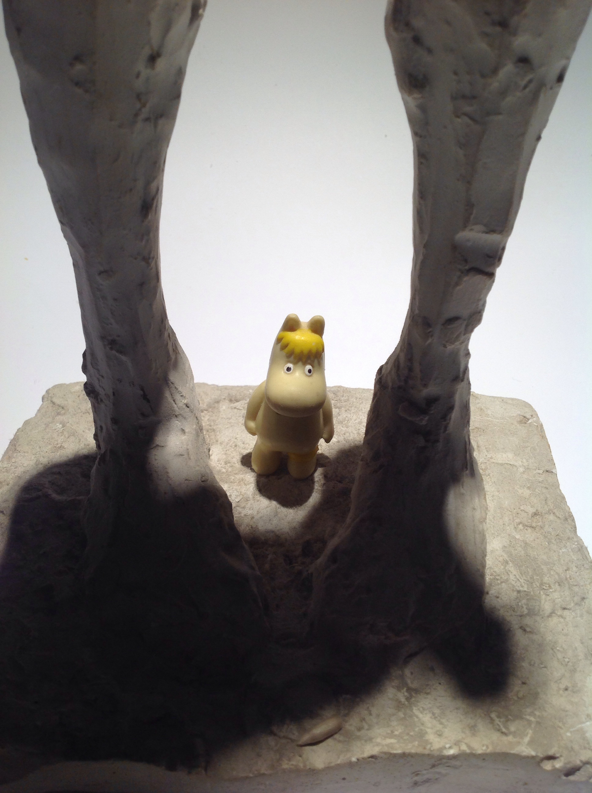 Bild 1. Snorkfröken mellan fötterna på en kraftigt beskuren skulptur. Skulptur av Staffan Nilsson 1971. Foto: Emma-Kara