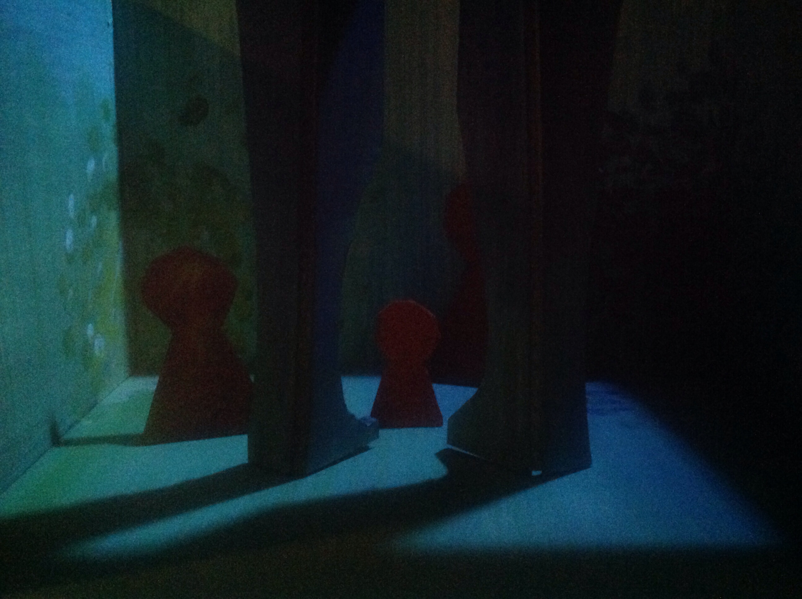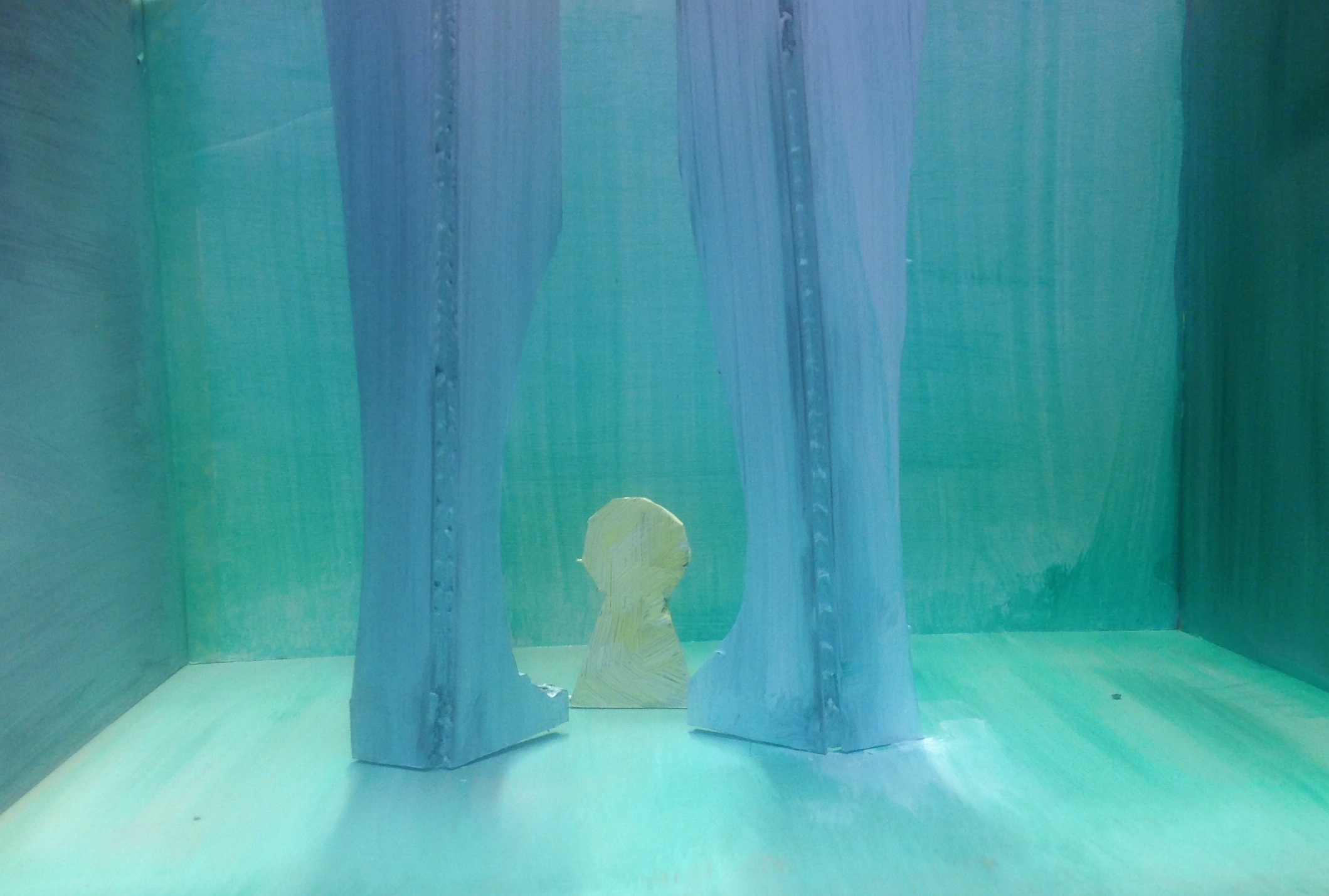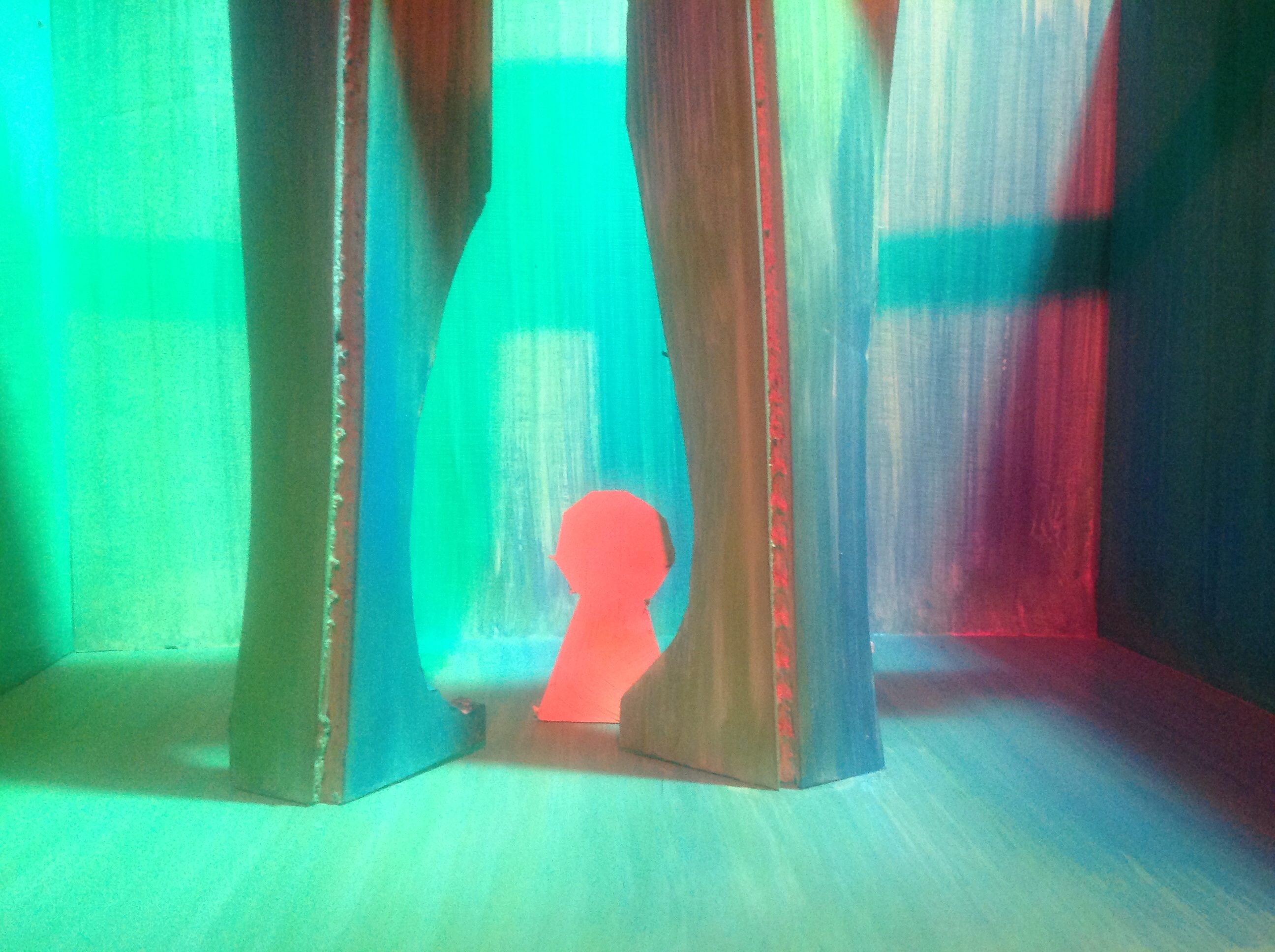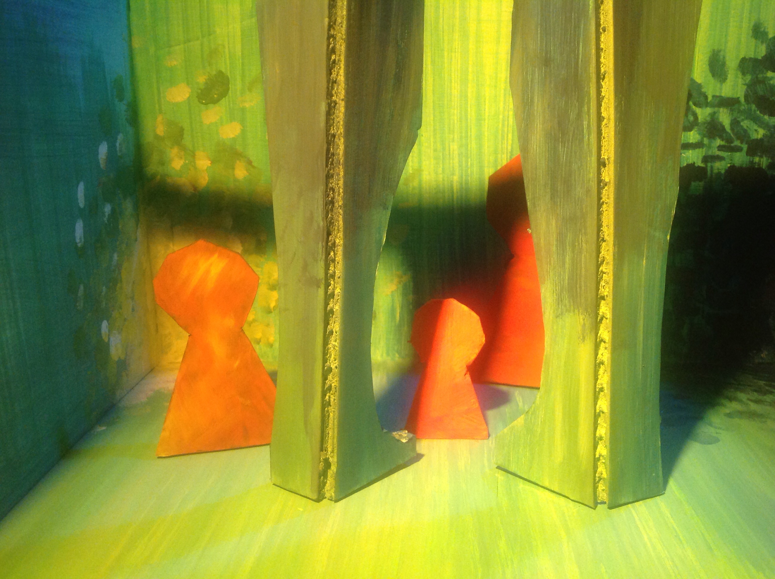 En figur mellan två lodräta ben som i modellen fått karaktär av (träd)stammar. Eftersom figuren är liten och ensam valde jag att försöka få den att upplevas mindre liten och ensam. Jag färgade in den med varmt ljus, se bild 3.