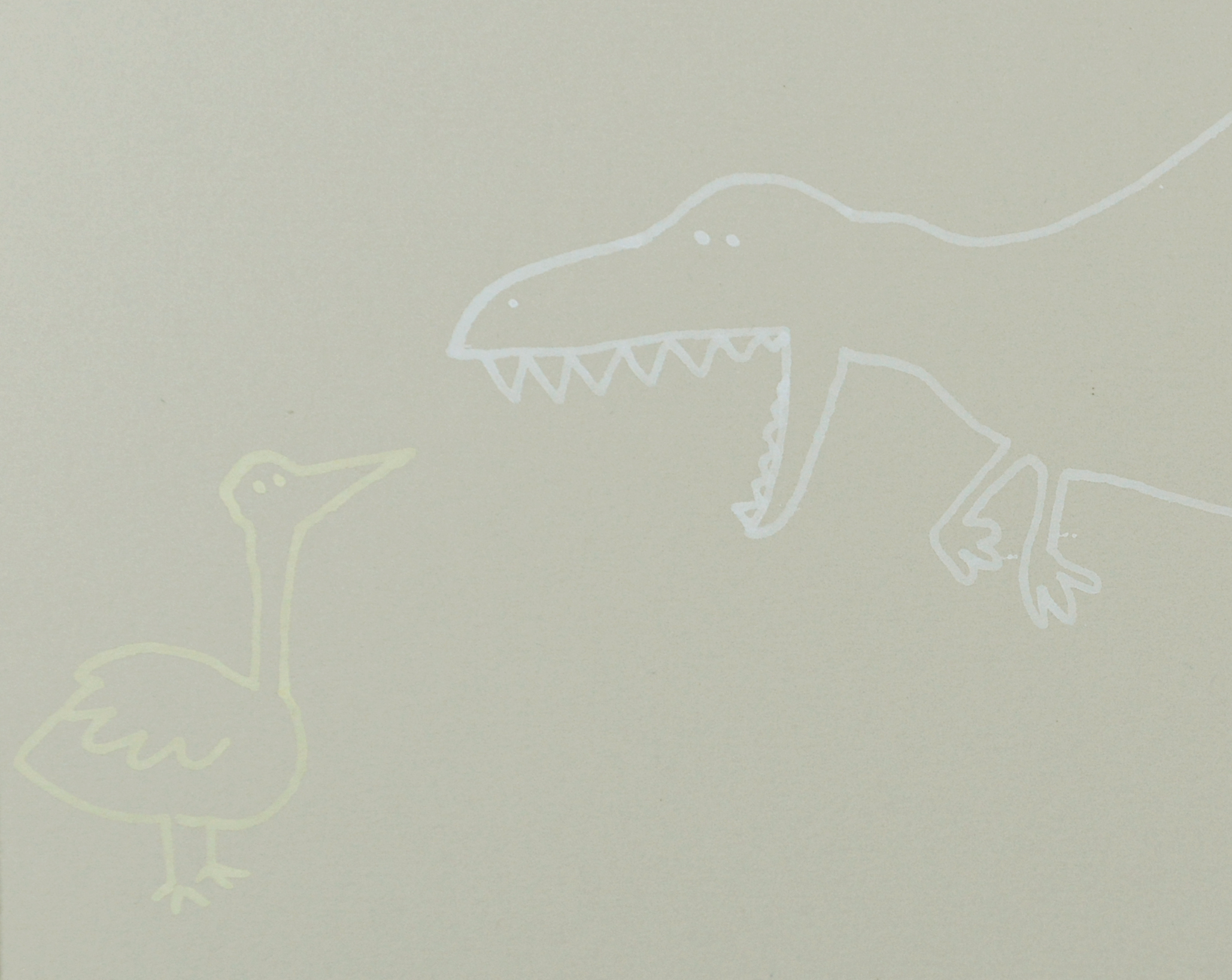 Illustration Nikita Johansson. Dinosaurie möter fågel.