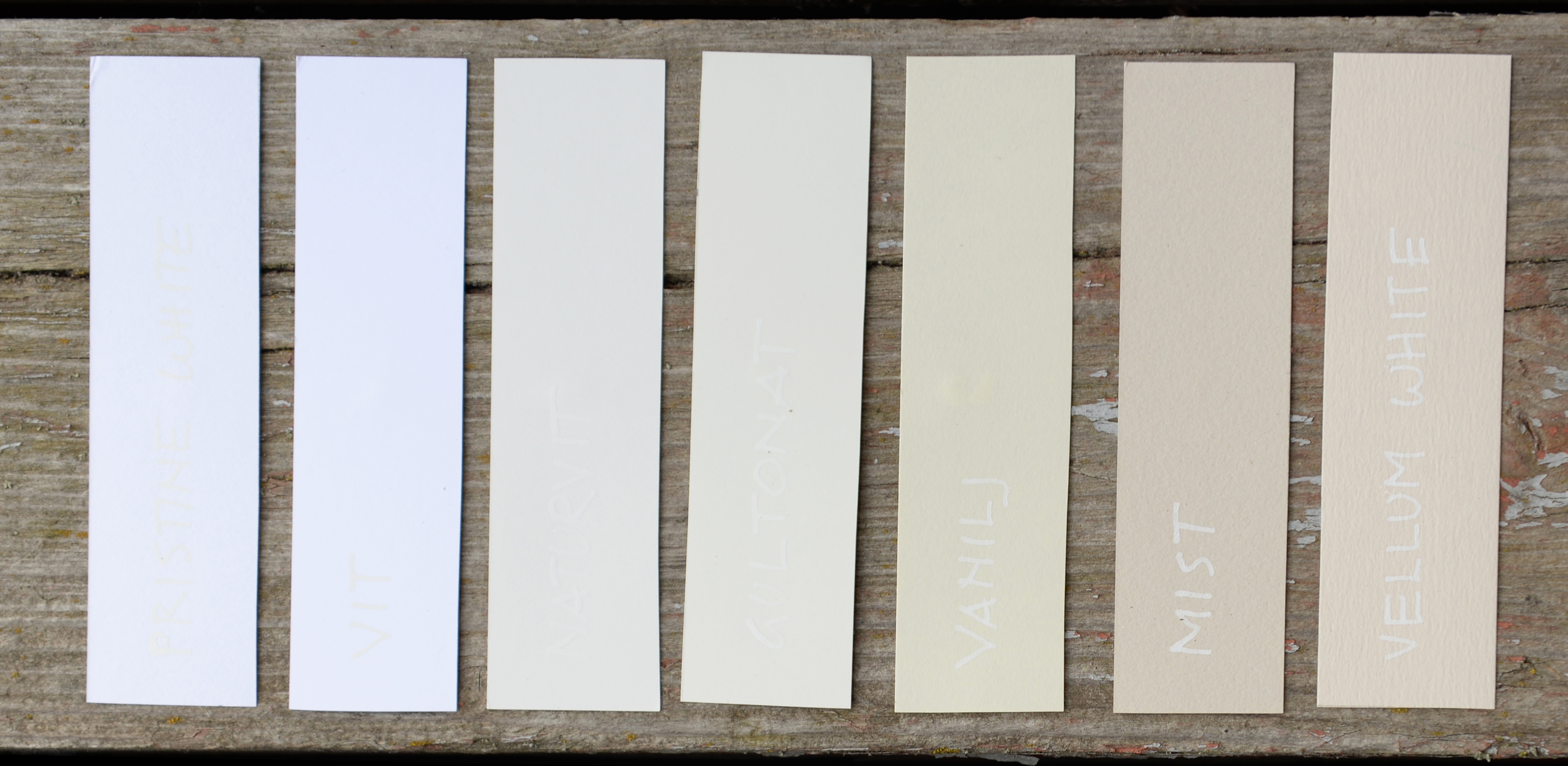 Från vänster: Pristine White, Vit, Naturvit, Gultonat, Vanilj, Vellum White och Mist.