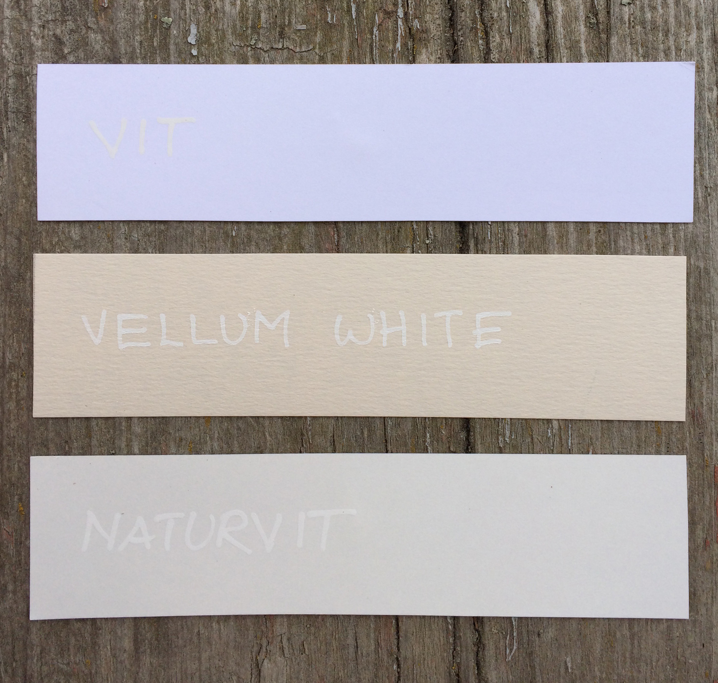 Tre olika papper, samma vita penna, Vit, Vellum White och Naturvit..